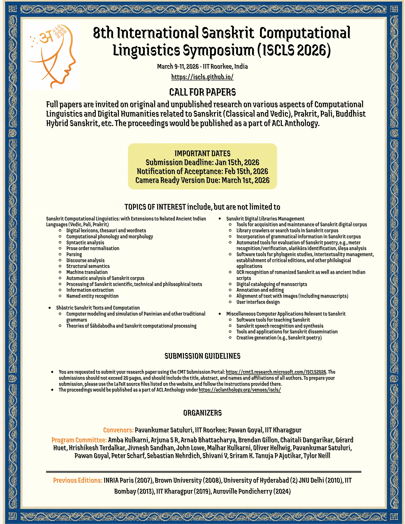 Call for Papers for the 8th International Sanskrit Computational Linguistics Symposium (8th ISCLS) at IIT Roorkee, Roorkee, India.